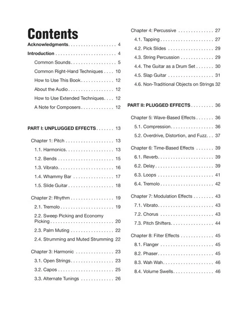 Book with online audio. The sonic possibilities of the modern guitar are nearly endless. This book shows you how to create a huge variety of analog and digital sounds using myriad techniques, pedals, plugins, amps, accessories and more. The 83 audio tracks feature demonstrations of each notated sound effect, along with specially-composed etudes that put them in a musical context. Covers: reverb & delay, looping, wah wah, distortion, compression, studio effects, slide guitar, sweep & economy picking, alternate tunings & capos, tapping, harmonics, bends, lots more. Note/tab. 78 pp.