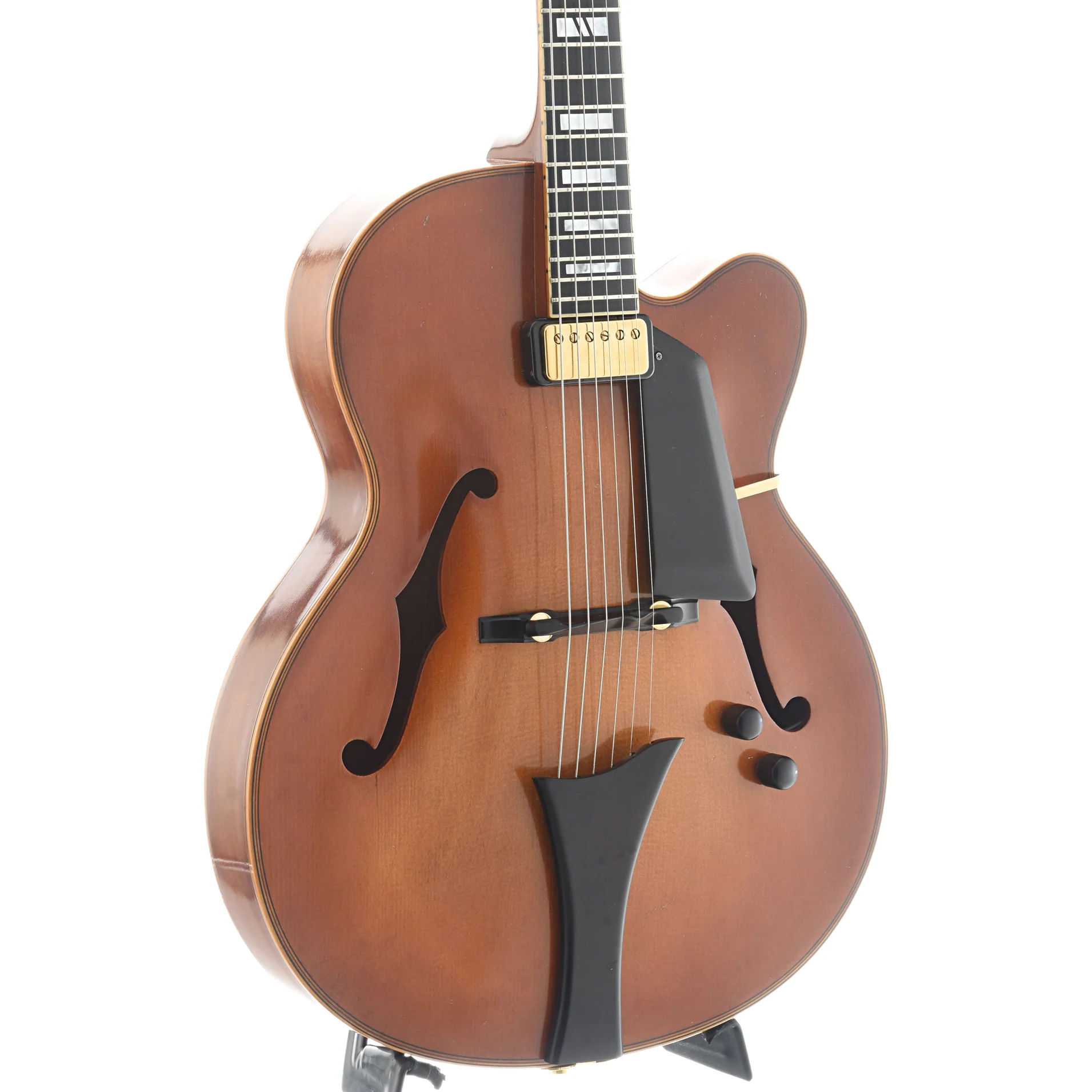 Vintage violin finish on solid hand carved German spruce top, 16” lower bout, highly flamed maple back & sides, joins body at 16th fret, 22 fret ebony fingerboard, pearl block inlays, ebony bridge, tailpiece & pickguard, pearl "lily" inlay on headstock, Hofner/Kent Armstrong floating pickup, modified X-tone bar bracing, gold hardware, Schaller tuners with ebony buttons, 25” scale, ~1-11/16” nut, limited edition #1 of 50, with OHSC (case has built-in hygrometer), made in Germany, VG-EC except one small repaired top crack by bass-side F-hole