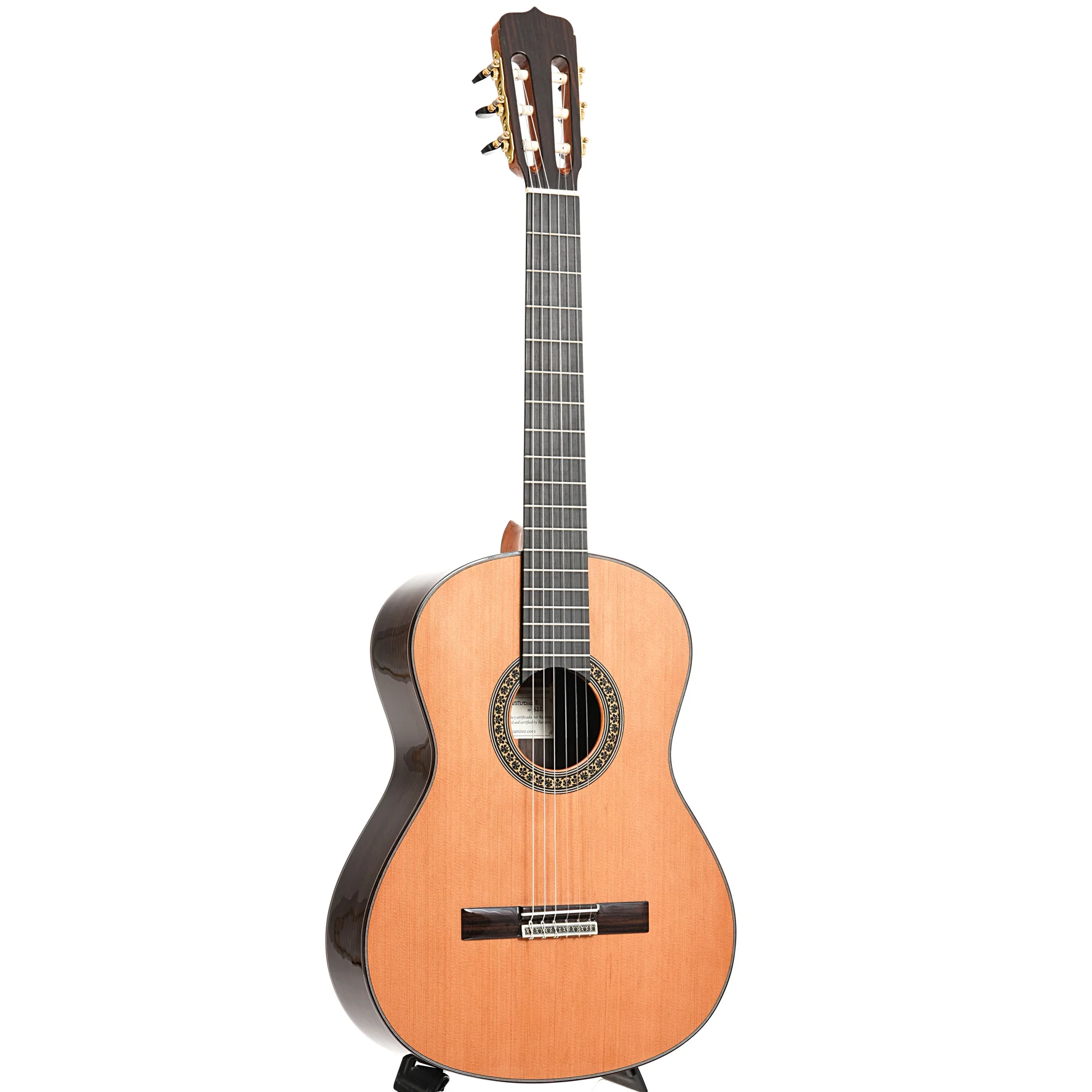 The Jose Ramirez Studio 2 is a finely crafted, well balanced classical guitar. The combination of a solid cedar top with solid Indian rosewood back and sides offers good sustain and rich overtones.