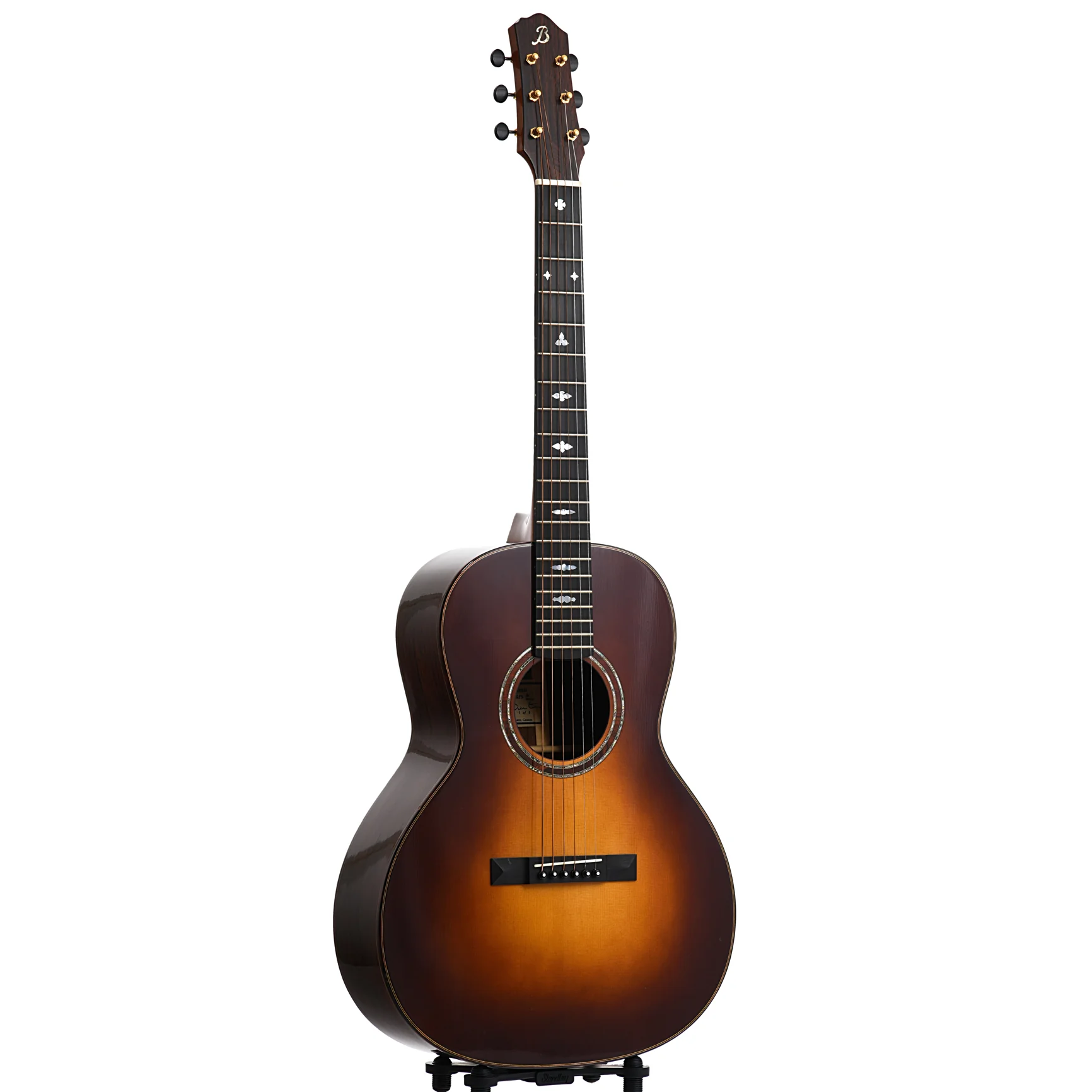 A beautiful limited run guitar, this Beneteau Nick Lucas Model Dream Series has a sunburst finish Adirondack spruce top, Brazilian rosewood sides and 3-piece back, and a 13-fret mahogany neck. The ebony fingerboard features varied pearl inlays. Other appointments include a double abalone soundhole rosette, Brazilian headstock overlay and underlay, and gold Waverly tuners.