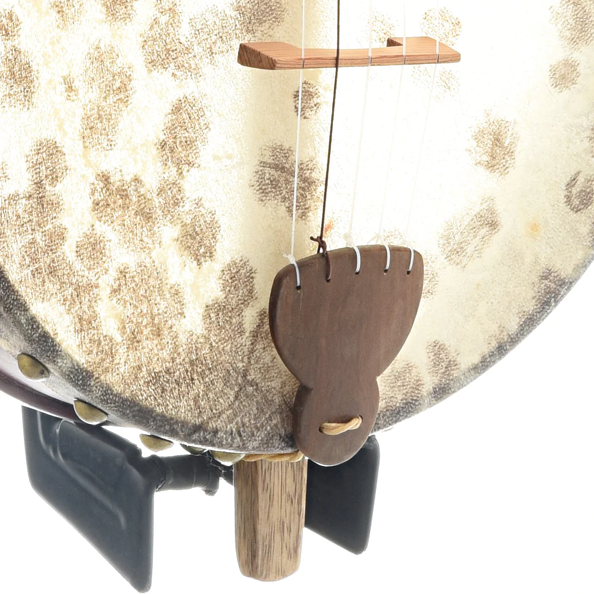 Handcarved mango neck with large S-shape peghead, 12" bent rim with skin head glued and tacked in place, handcarved tuning pegs, Nylgut strings. Fingerboard surface tapers to the rim leaving extra finger room the way a scoop would. Scale is approx 26"
